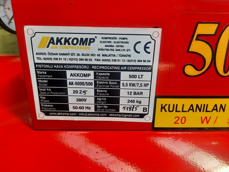 Bakımları yapılmış, çalışır durumda ve kullanıma hazır olan AKKOMP 500 litre kompresör, firmamız güvencesiyle satışa sunulmaktadır. 2026 model bu kompresör, güçlü performansı ve güvenilir yapısıyla işletmeler için ideal bir tercihtir.
